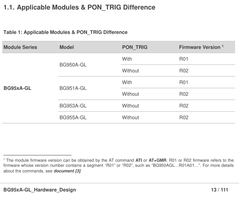 But the doc does not specify how to tell the difference on hardware. The module I am using now is BG950AGLAA-N06-SGNSA, does this suggest PON_TRIG functionality, or if there is a way to tell from serial number?