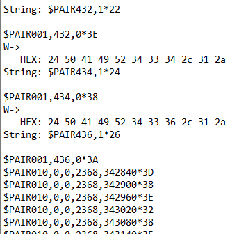 According to the protocole specification I should get $PAIR001,432,03E. But in these example I get $PAIR010,0,02366,59120134. After retrying later I simply get nothing after more than 20min.