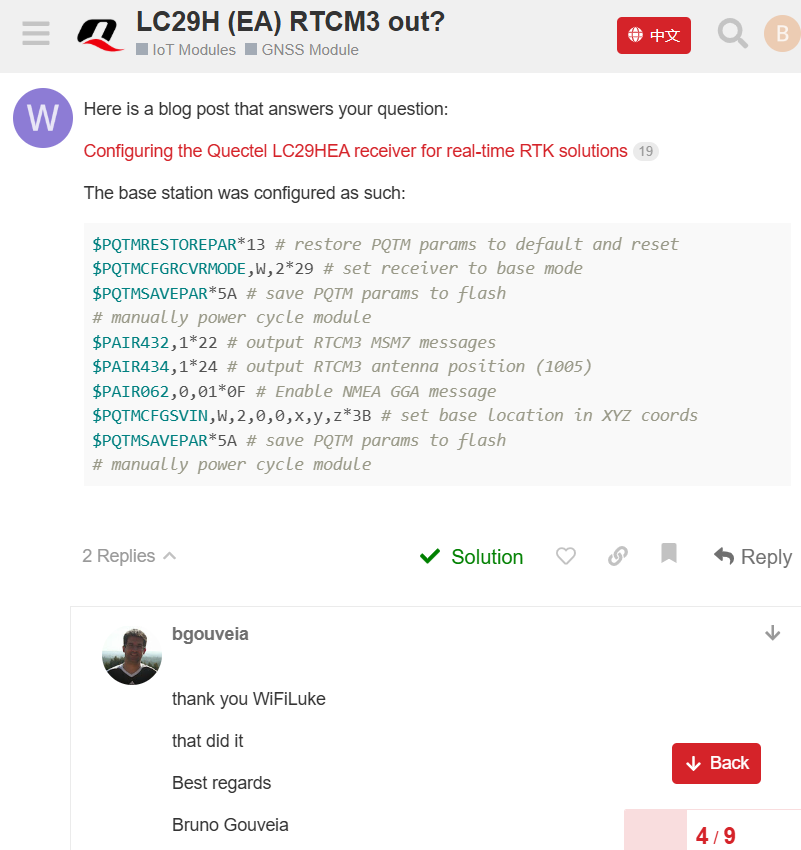 I received all that about two weeks ago and since then I could make the LC29HEA work fine in GPS mode with QGNSS or the esp32 and print the NMEA messages in the Serial monitor. With QGNSS, using the centipede network, I could’nt have RTK fixed, only RTK float but I think it is because the nearest centipede station is 20km away from where I live. But that is not what I want to do anyway. I have a code to give commande to my lc29hea :