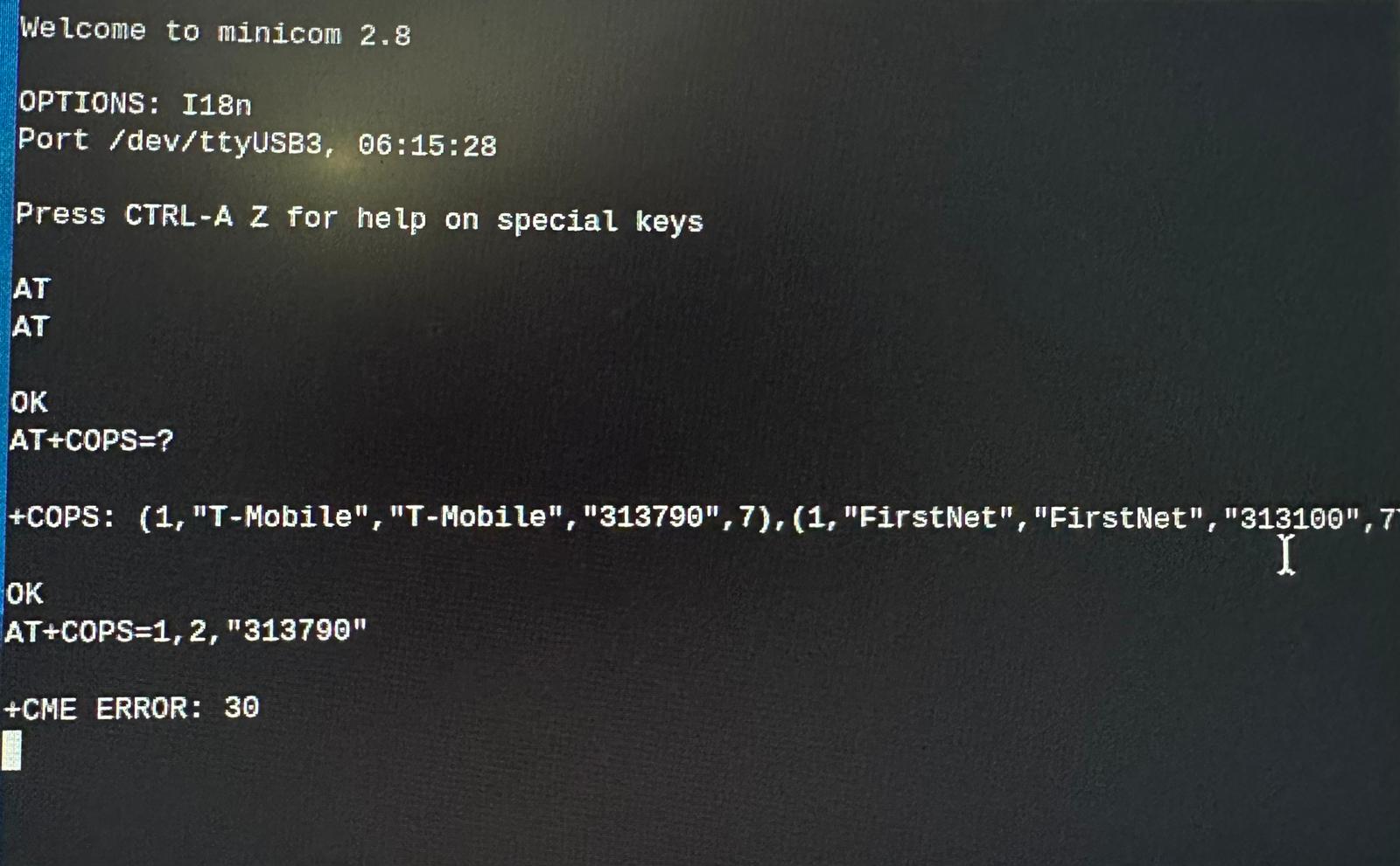 I’m trying to connect a Raspberry Pi W2 to a module that includes a Quectel RM502Q-AE, but I’m encountering some issues. When I run the AT+COPS=? command, I can see available networks, including T-Mobile (313790) and FirstNet (313100). However, when I attempt to manually select a network using AT+COPS=1,2,"313790",7 or similar variations, I keep getting an error.
