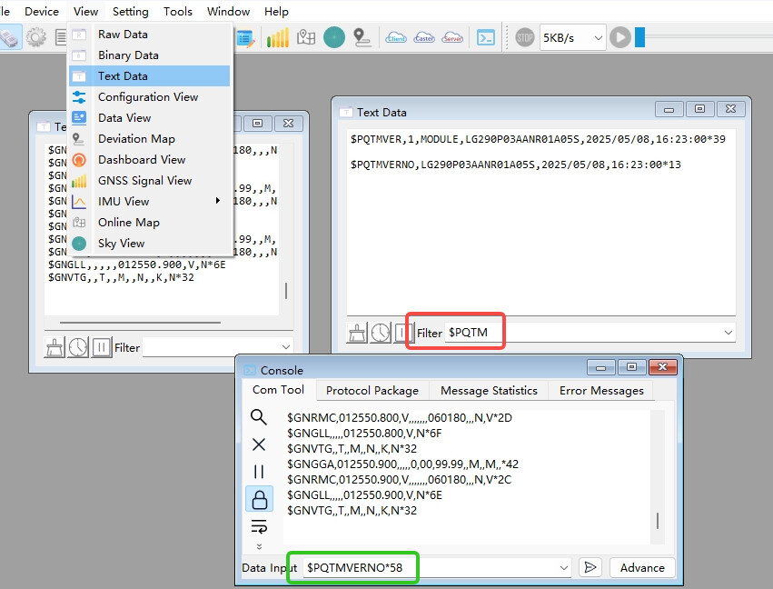 As as test case, I have transmitted the PQMT message $PQTMVER58 to see if I could receive the firmware version. So the question is, how am I supposed to see the received firmware version message if I have both the received and transmitted NMEA message buttons on. I know that the $PQTMVER58 is being sent as I can see it in the Console window when the received NMEA message button (up arrow) is off and the transmitted NMEA message button (down arrow) is on. However, I can see no way to see the LG290P response to the $PQTMVER*58 NMEA firmware request message mixed in with the satellite NMEA messages from the LG290P in the Console window.