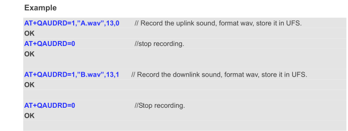 And if you want to stop recording, it is better to use the command AT+QAUDRD=0 to stop it. But i can not see such command in your test log. Please double check it. And the following test example just for your reference. Please confirm it. Thanks!