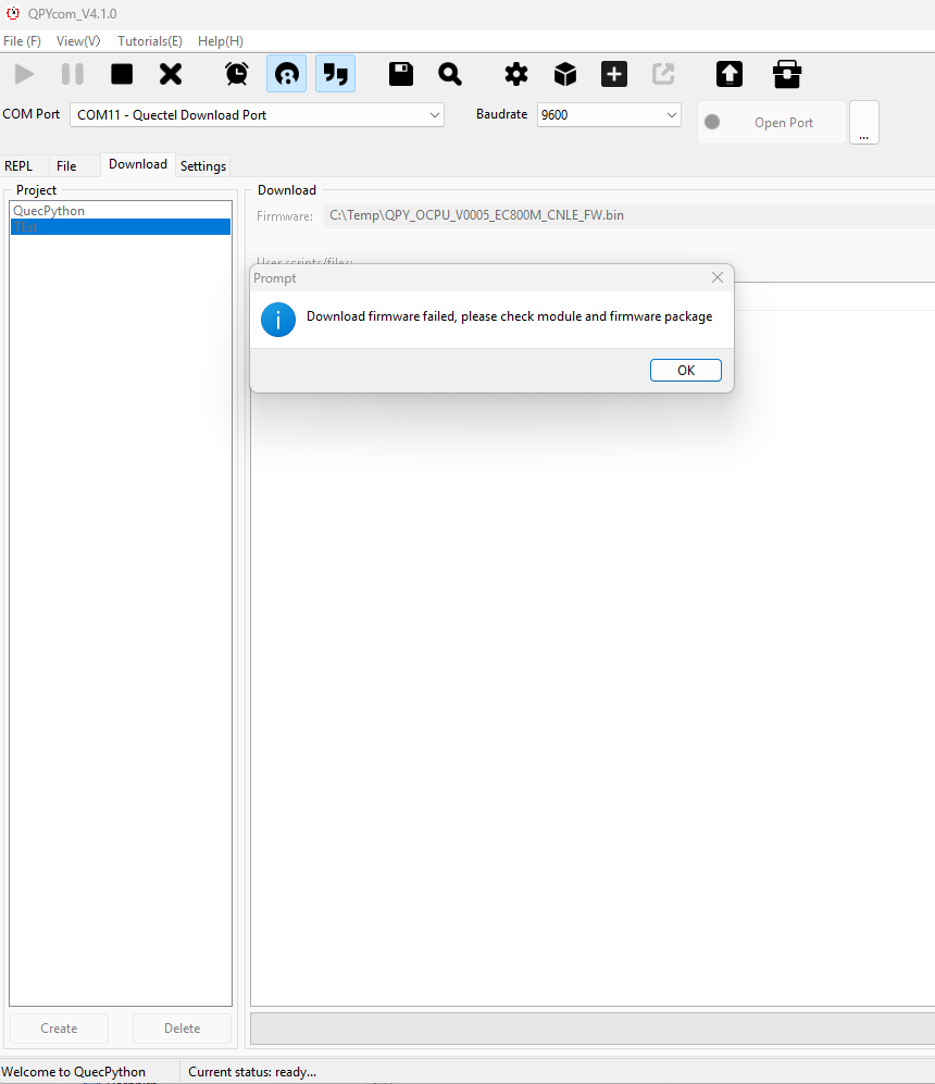 I’m trying to flash a new firmware onto an EC800M using QPYCOM, but the process keeps failing. When I start the flashing process, the USB port switches to the Quectel download port, but then nothing else happens. What could be causing this?