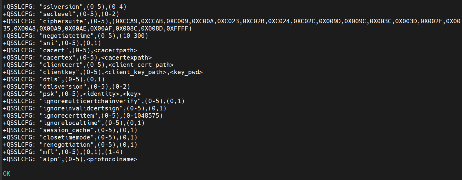 Thank you very much for your detail description. After executing AT+QSSLCFG=?, we get following output: