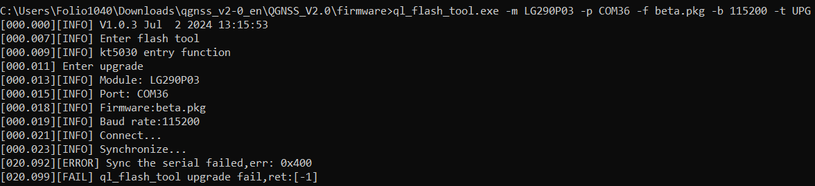 I used a separate serial port for sending the command. Tested the firmware update on UARTs 1 and 2. The QGNSS always reports the sync error after 20s of trying, Sync the serial failed,err: 0x400. I can see the tool sending the sync packets but the LG290P does not respond.