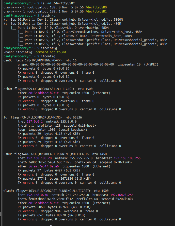 - First, I plugged the EC25 into the board and recognized the USB as follows. However, only ttyUSB0 and ttyUSB1 were recognized. The manual document states that ttyUSB2 and ttyUSB3 are also recognized.