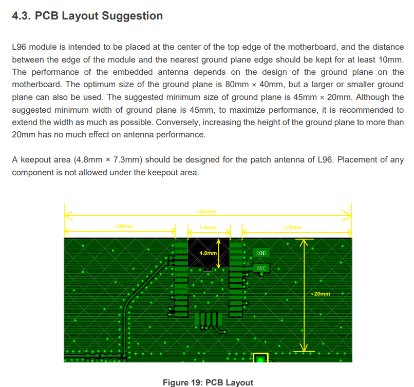 I am try to get a fix using the L96 on a custom PCB. After 30-40 minutes of open skies, no satellites are seen as indicated by the GSV message. I am using the internal antenna and have verified that RF_in and RF_out are connected.