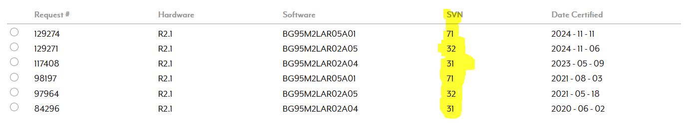 What AT command (or where can I find) the SVN for the BG95M2 module I am using? I’m trying to get end-device certification for PTCRB and they are asking for an SVN. The options seem to be 71 or 32.